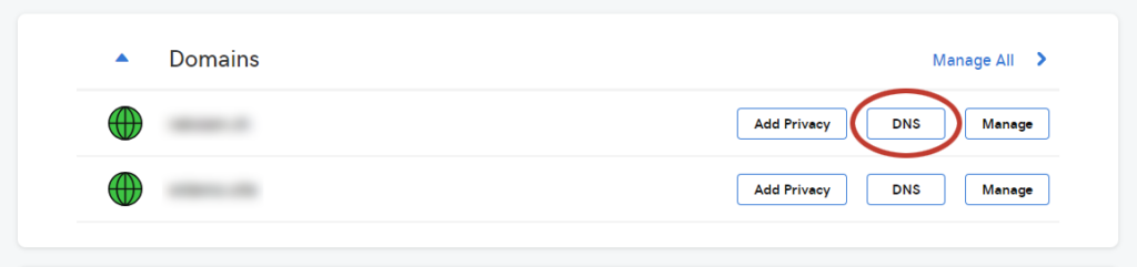 Once logged in, you will see listed all the domains purchased by you. Click on DNS on the domain you want to connect.