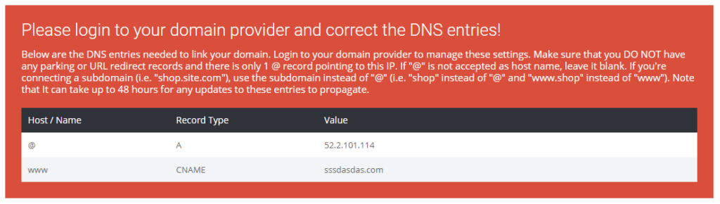 After adding the domain, a screen with 2 DNS records will show. These are the records you need to add to your domain settings in your domain provider. Every domain provider should allow you to add these records to your domain. If you can’t find them, you can contact your domain provider and ask how to add them. They will connect your domain to your website.