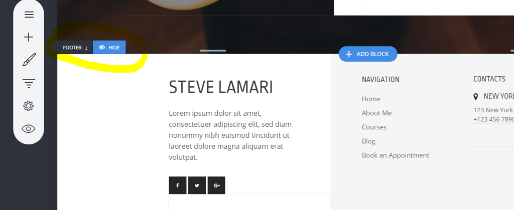 Everything that you add in the Footer area will show on all pages that have the footer enabled. To hide the footer for a page, click on the Hide button.