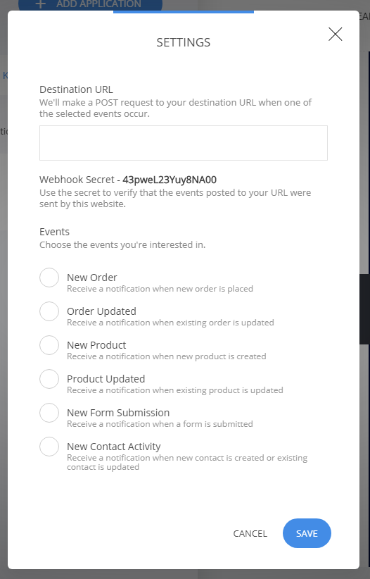 To create a webhook, go to Website Settings > Applications and click on “Add Application”.