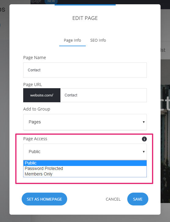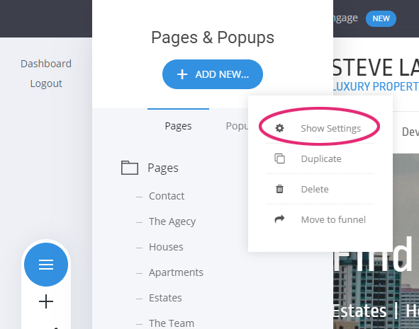To access page settings, click on Pages, and on top of each page, you have a pencil icon that opens the Page Settings.
